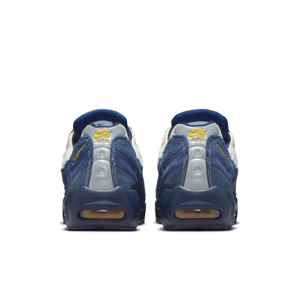 ネイビー×イエローのグラデーション、左右非対称の「Koston」「Air Max」タンパッチ、サイドに配したタイ語ロゴなど、Koston のバックグラウンドとスケートカルチャーを詰め込んだ一足。アッパーはスエード+メッシュで補強され、SB仕様のアウトソールとあわせて、Air Max 95 をそのままスケートに持ち込める仕上がりになっています。
