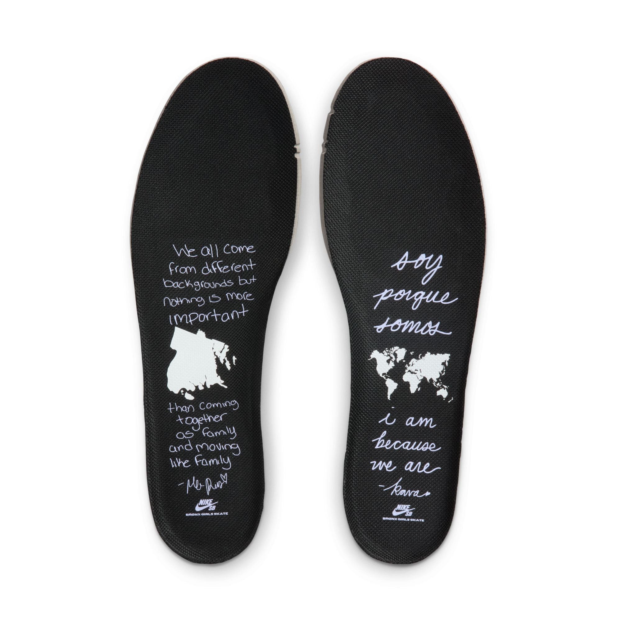 半透明アウトソールの下には地下鉄モチーフのカスタムアートやBXGSのグラフィティ、「The Bronx, The World」のメッセージを落とし込み、ヒールにはNYを象徴するジュエリー風ディテールもプラス。ソックライナーにはBXGSらしい言葉が添えられた、チームのスピリットとプライドが詰まった一足です。